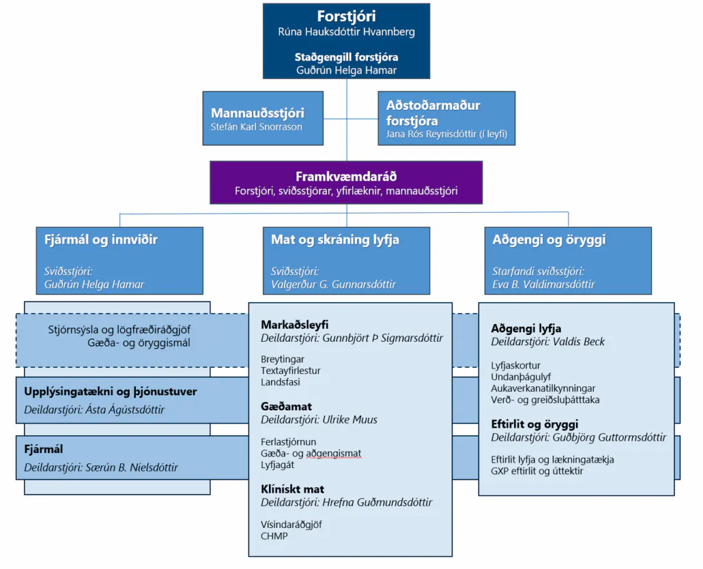 Skipurit Lyfjastofnunar frá skipulagsbreytingum árið 2024 hélt sér í meginatriðum. Starfsemin skiptist í tvö kjarnasvið og stoðsvið.